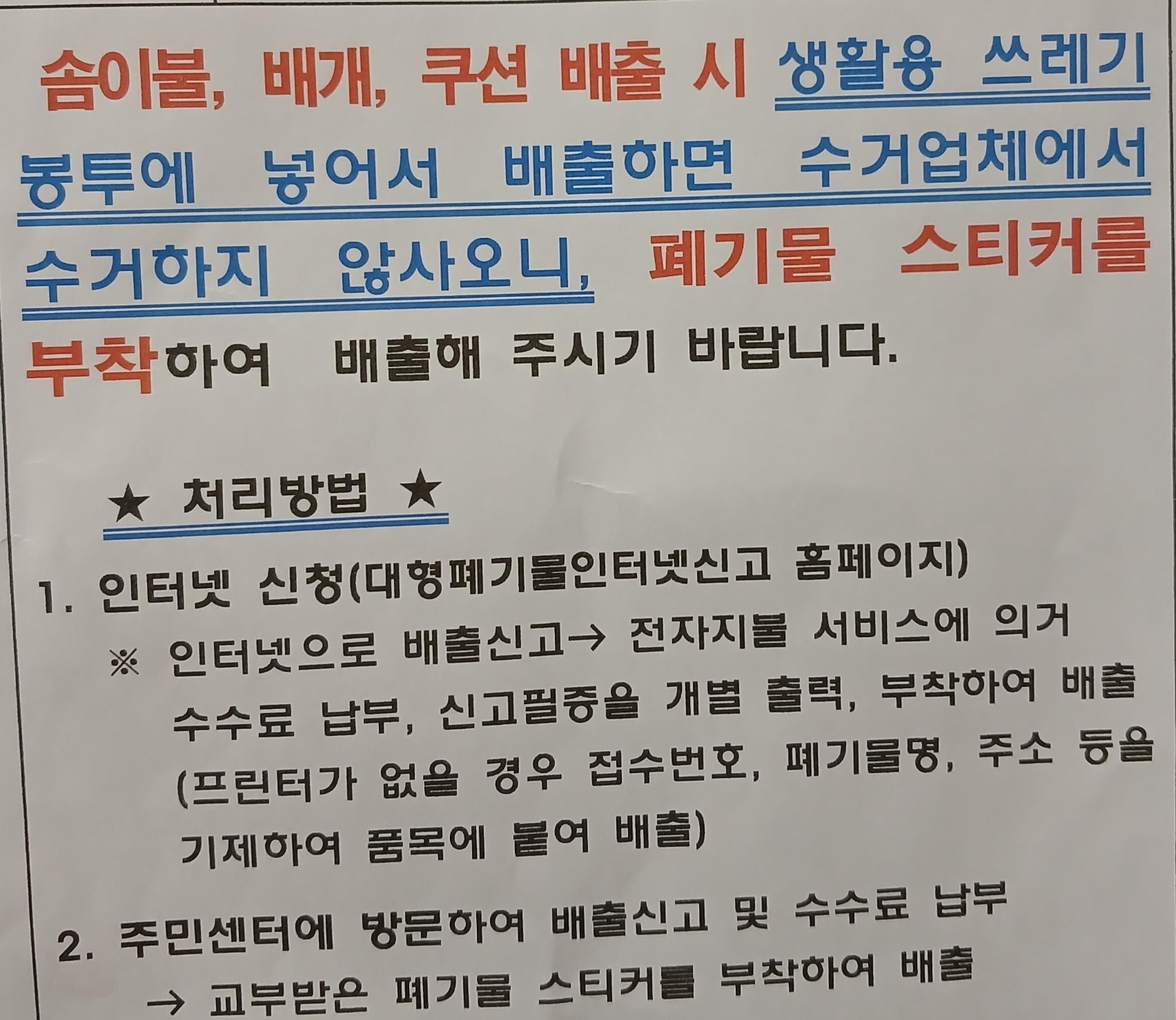 솜이불 베개 쿠션은 생활용 종량제 쓰레기봉투에 넣어서 버리면 안 되고, 폐기물 스티커를 부착하여 버려야 한다.