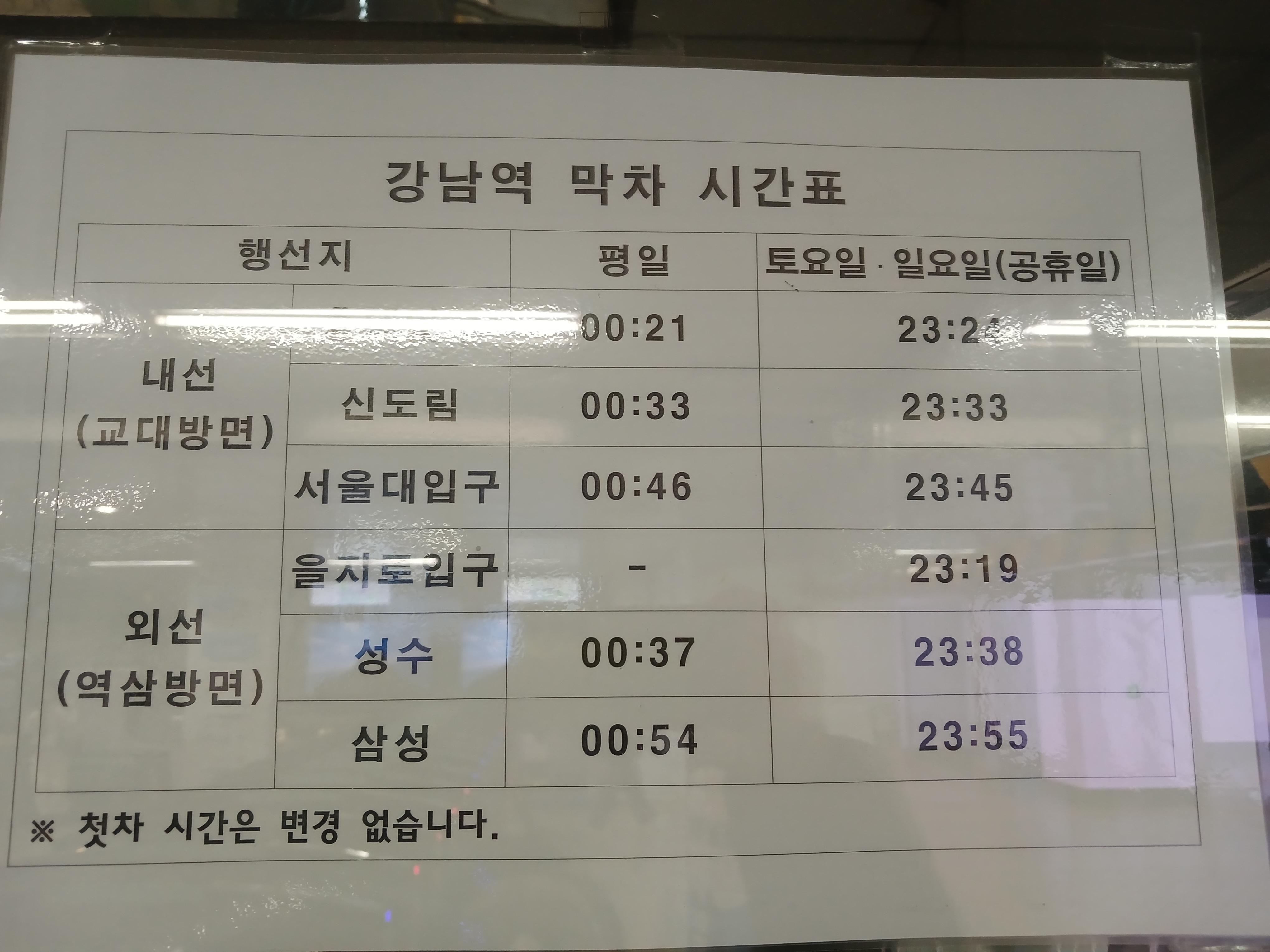 (성수역행) 평일 : 0시 37분 / 토ㆍ일(공휴일) : 23:38