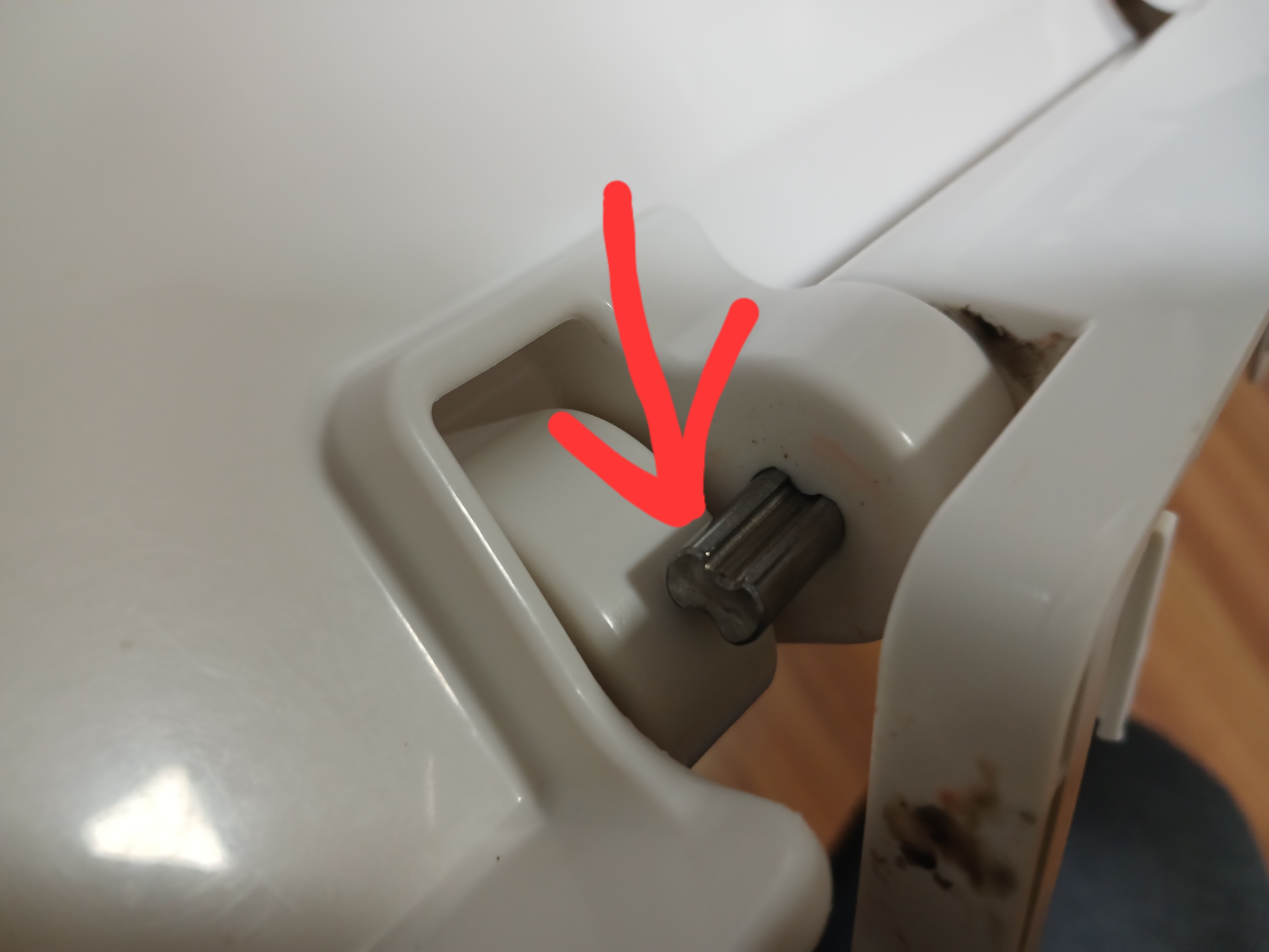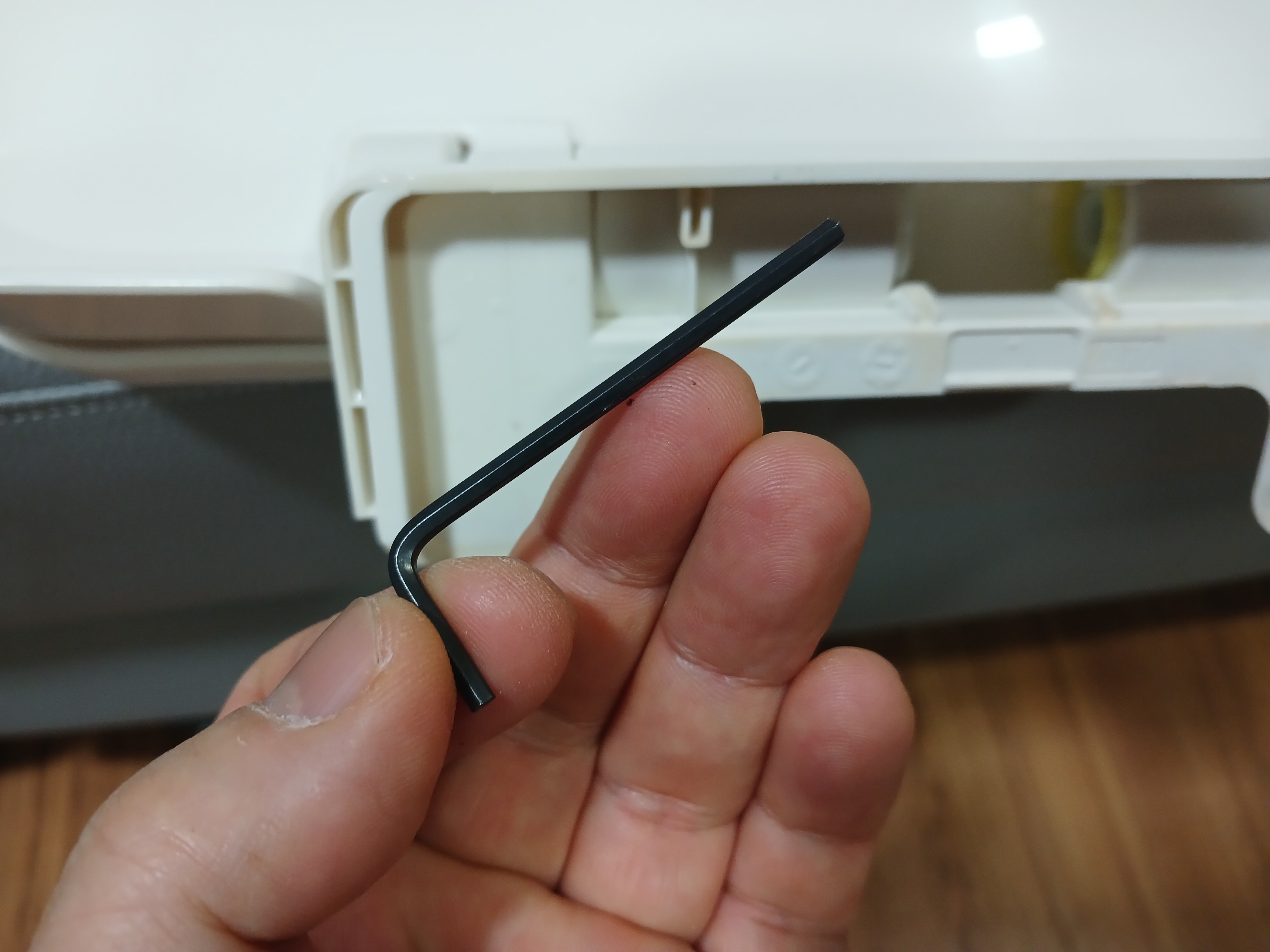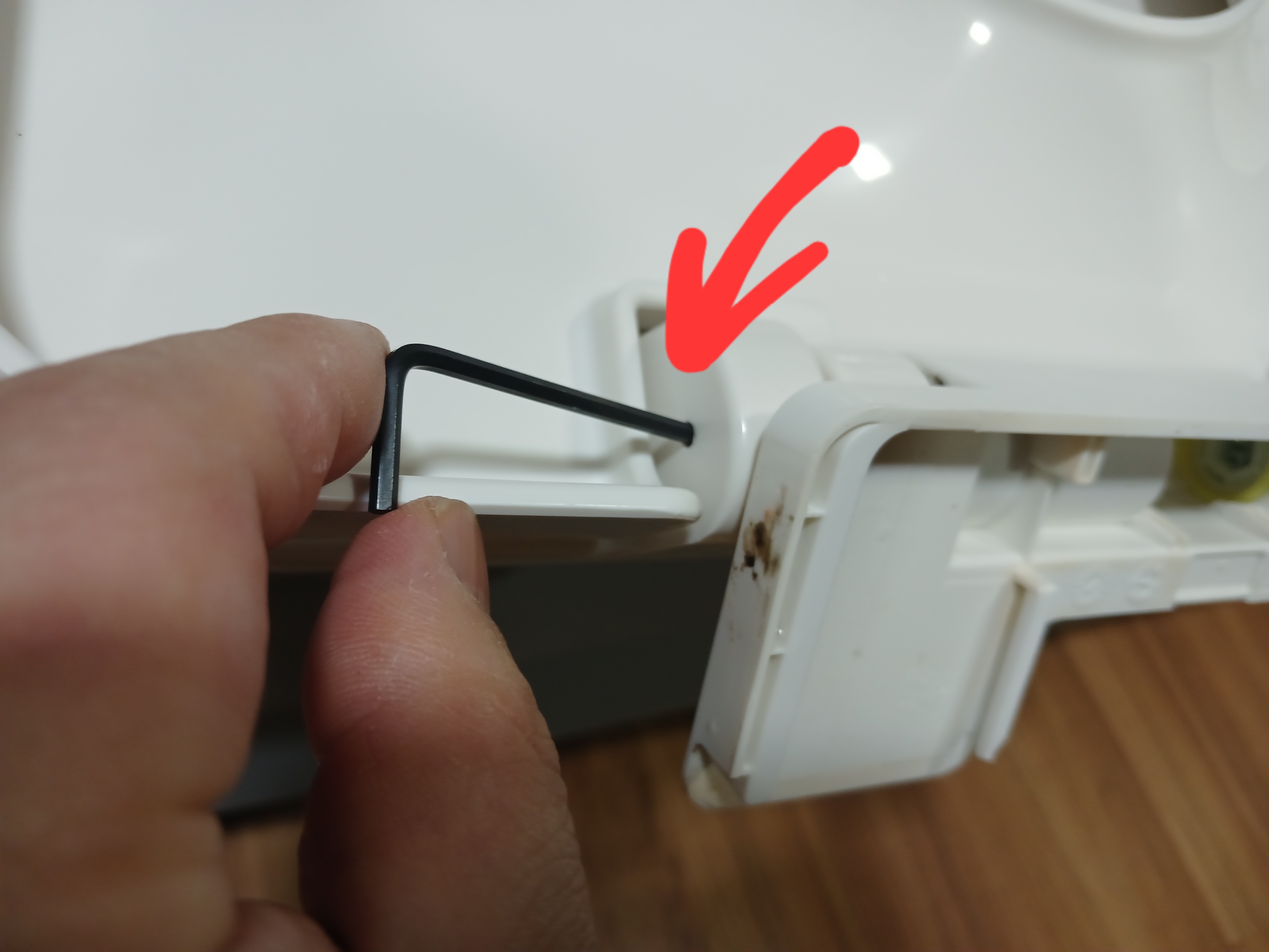 이 구멍을 육각렌츠로 누르면 칸막이가 있던 반대편으로 튀어나오는 부품이 있다. 이것이 뚜껑을 천천히 닫게 하는 역할을 하는 부품이다. 완전히 빠질 필요 없이 위 사진에 보이는 정도로 빠지면 된다.