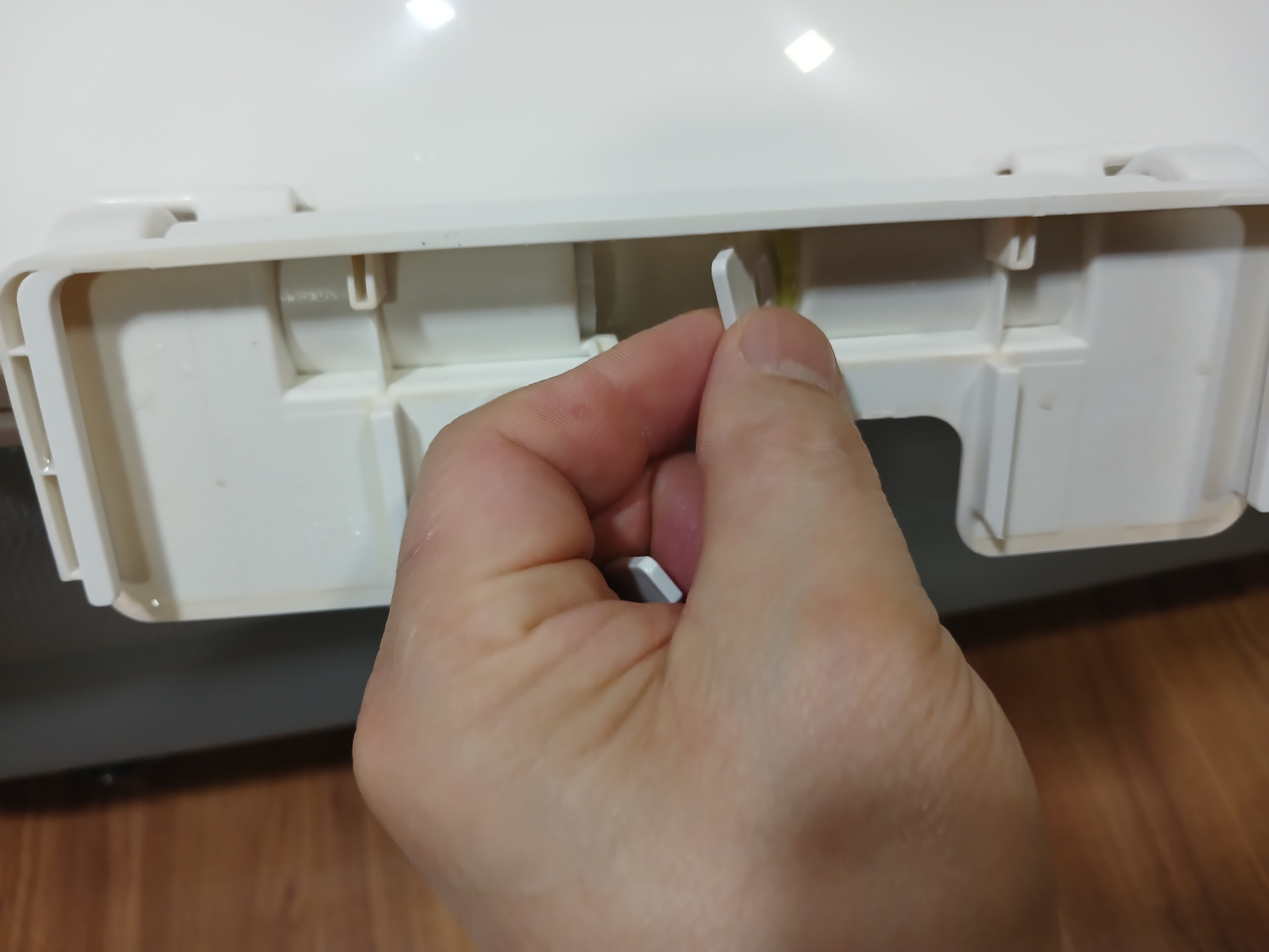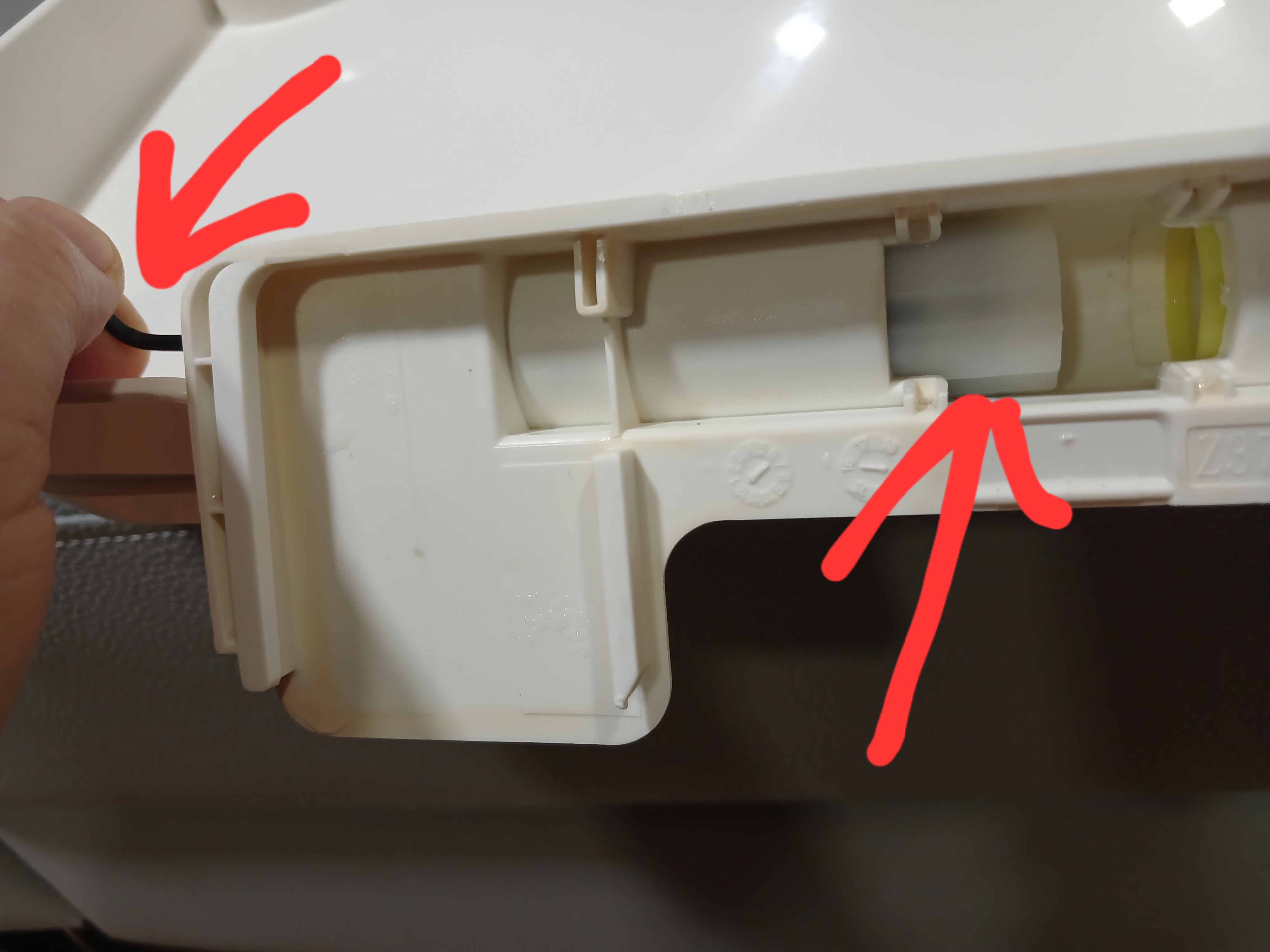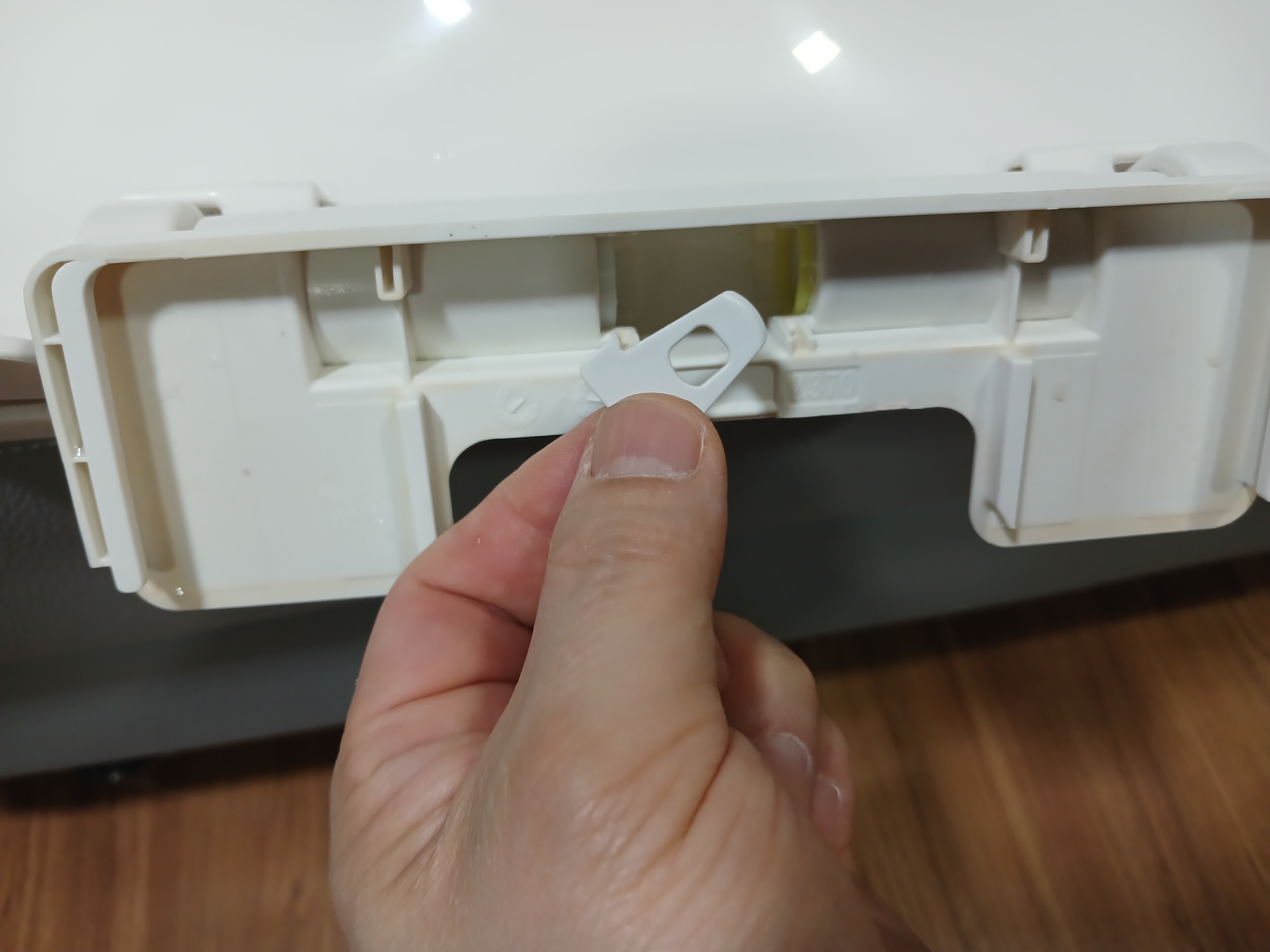 이 구멍을 육각렌츠로 누르면 칸막이가 있던 반대편으로 튀어나오는 부품이 있다. 이것이 뚜껑을 천천히 닫게 하는 역할을 하는 부품이다. 완전히 빠질 필요 없이 위 사진에 보이는 정도로 빠지면 된다.