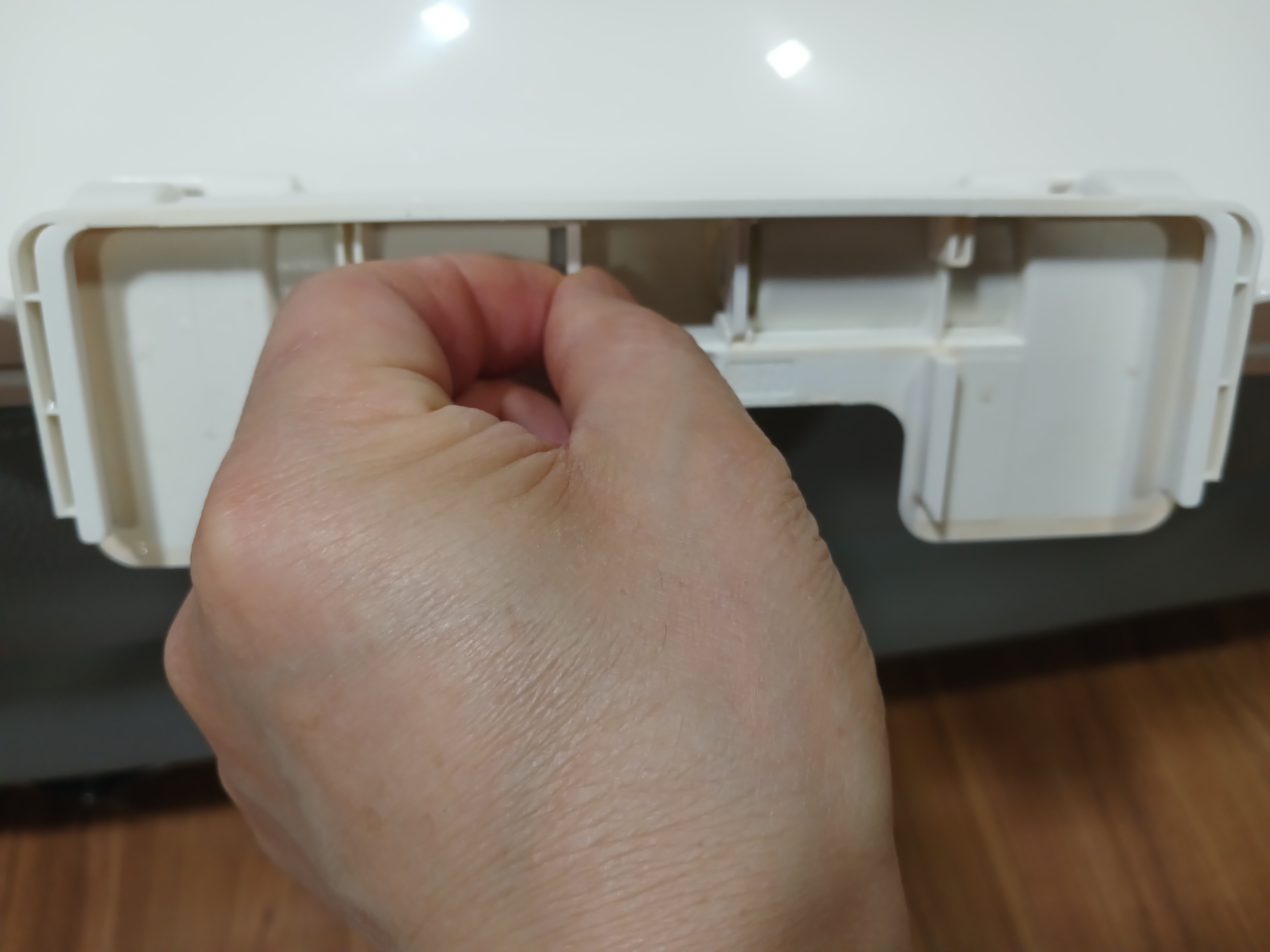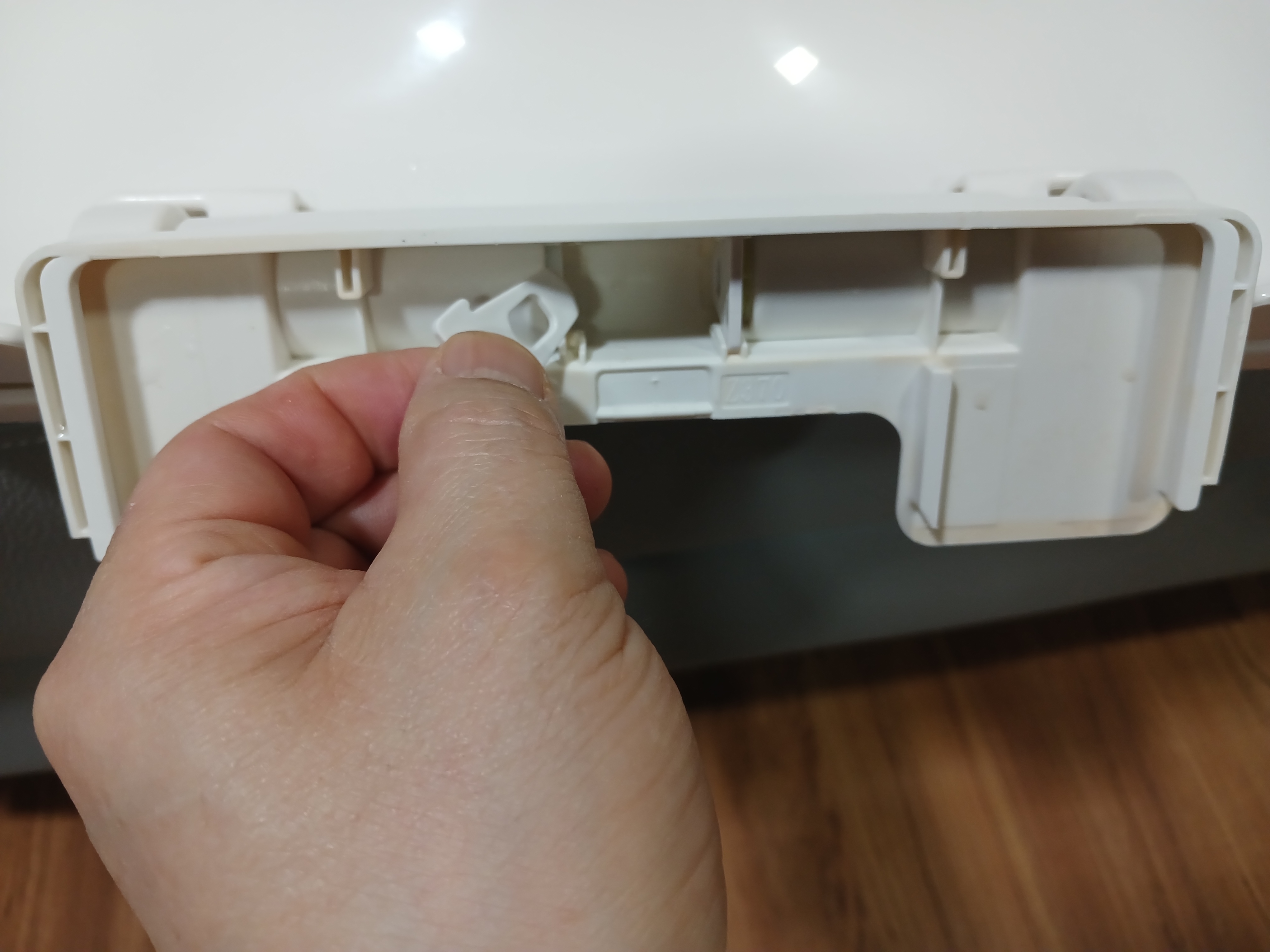 위 사진에서 경첩 부분을 잇고 있던 부품이 빠져 있는 것을 볼 수 있다. 반대쪽도 동일한 방법으로 해 주면 뚜껑이 분리된다.