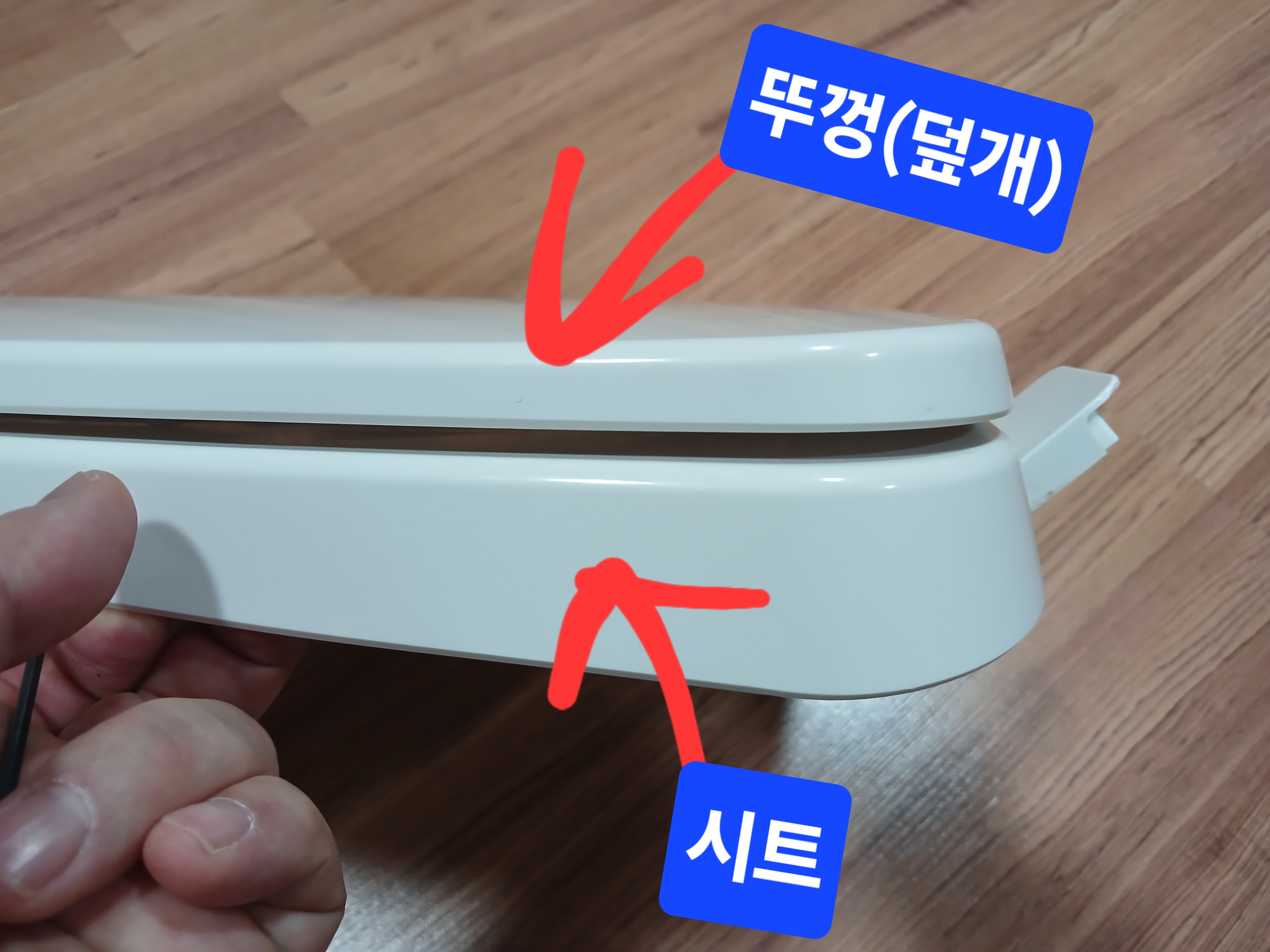 변기시트는 앉는 구분인 시트와 상단에 뚜껑(덮개) 구성되어 있다.